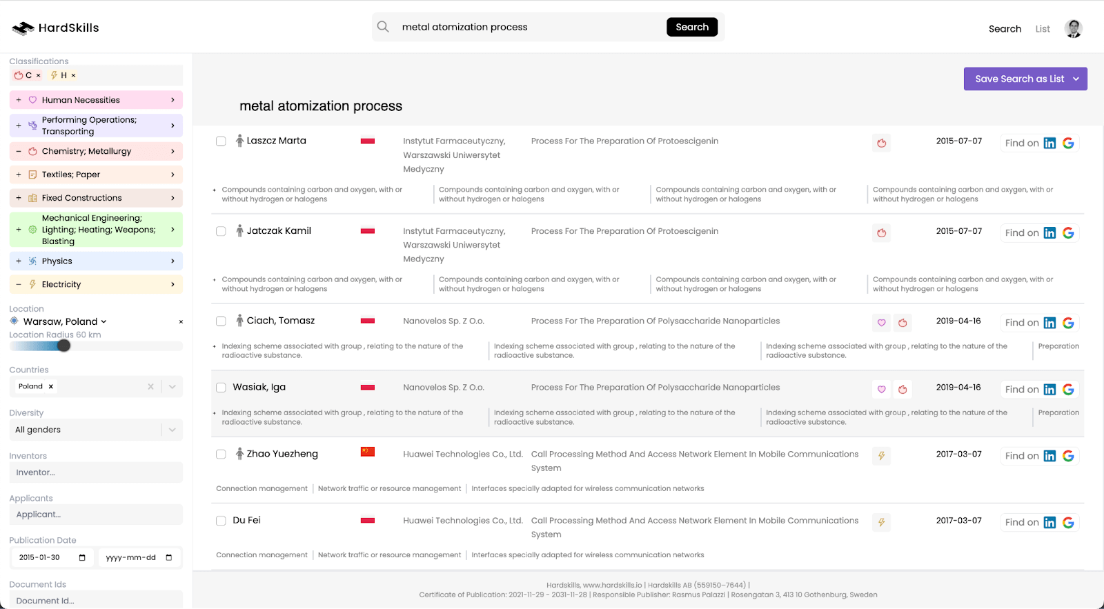 Let’s now say we know for sure the patent holder must have knowledge in both ‘electricity’ and ‘chemistry’ which is why we add those classifications to our filters. To make it even more granular, we have now concluded that the knowledge must be recent as it is a quick-moving field. Hence, the publication date is set to be post 2014. Lastly, we delimit the physical proximity to the desired location to 60 km as that is a fair commuting distance.